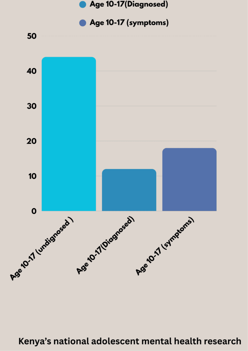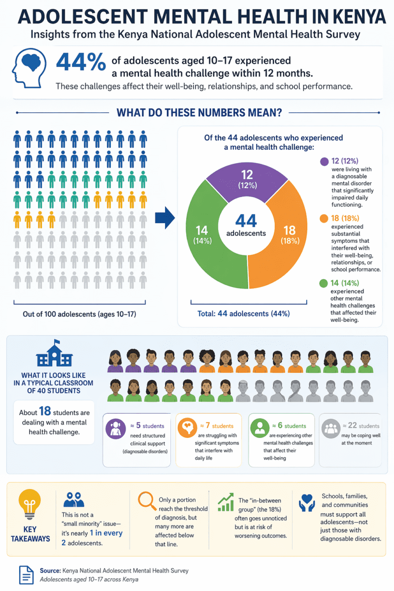 According to the Kenya National Adolescent Mental Health Survey, 44% of adolescents aged 10 to 17 experienced a mental health challenge within 12 months, affecting their well-being, relationships, and school performance.