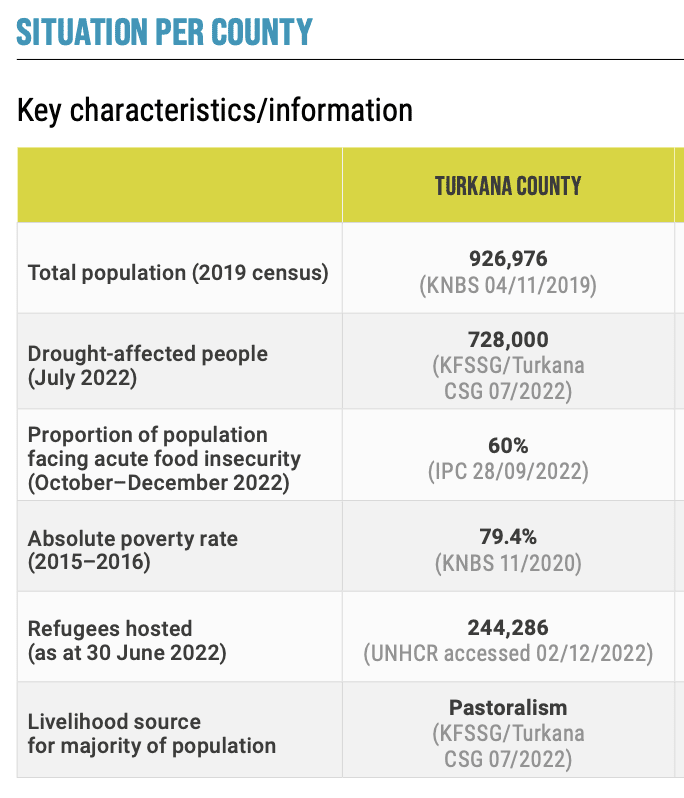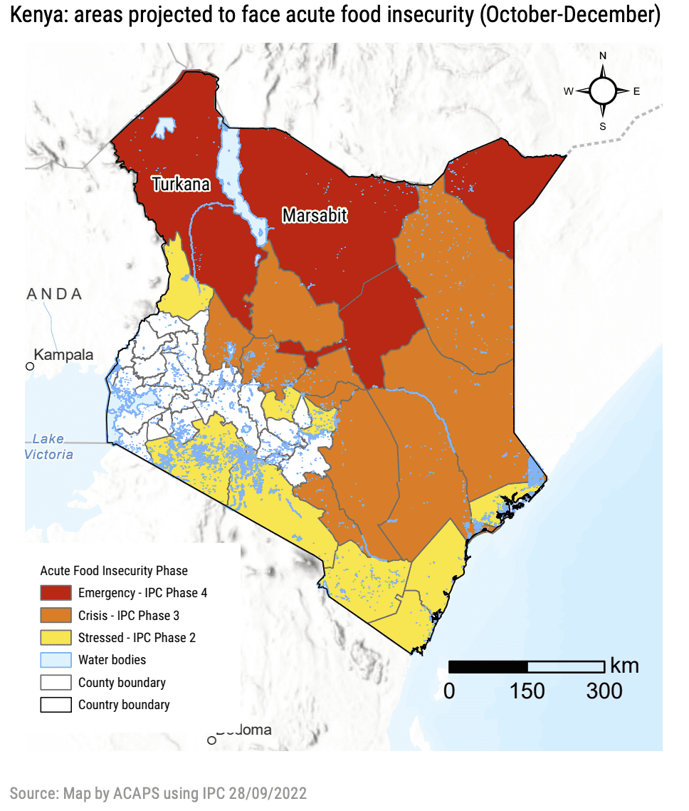An ACAPS drought impact report later projected that 556,000 people in Turkana would face Crisis (IPC Phase 3) or worse between October and December 2022—up from 139,000 during the same period in 2020.