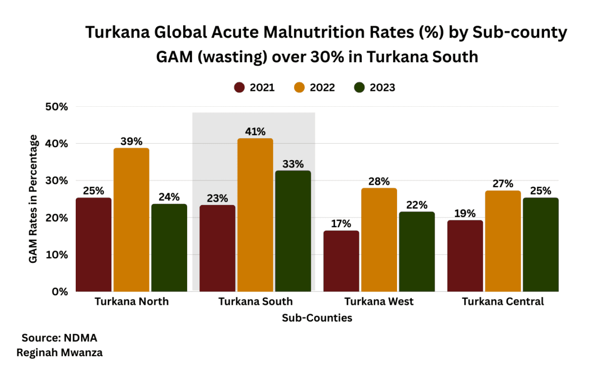 In a county where acute undernutrition among children under five consistently ranges between 21% and 37%, such shifts matter. A national IPC analysis published in September 2023 reported Global Acute Malnutrition (GAM) levels above 30% in Turkana South. This underscores how severe conditions remain, even with ongoing humanitarian assistance.