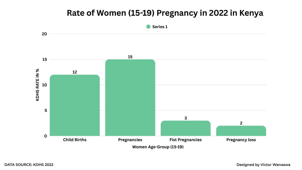 According to the Kenya Demographic and Health Survey (KDHS) 2022, 15% of women aged 15–19 in Kenya have been pregnant—12% having given birth, 1% experiencing pregnancy loss, and 3% currently pregnant with their first child.